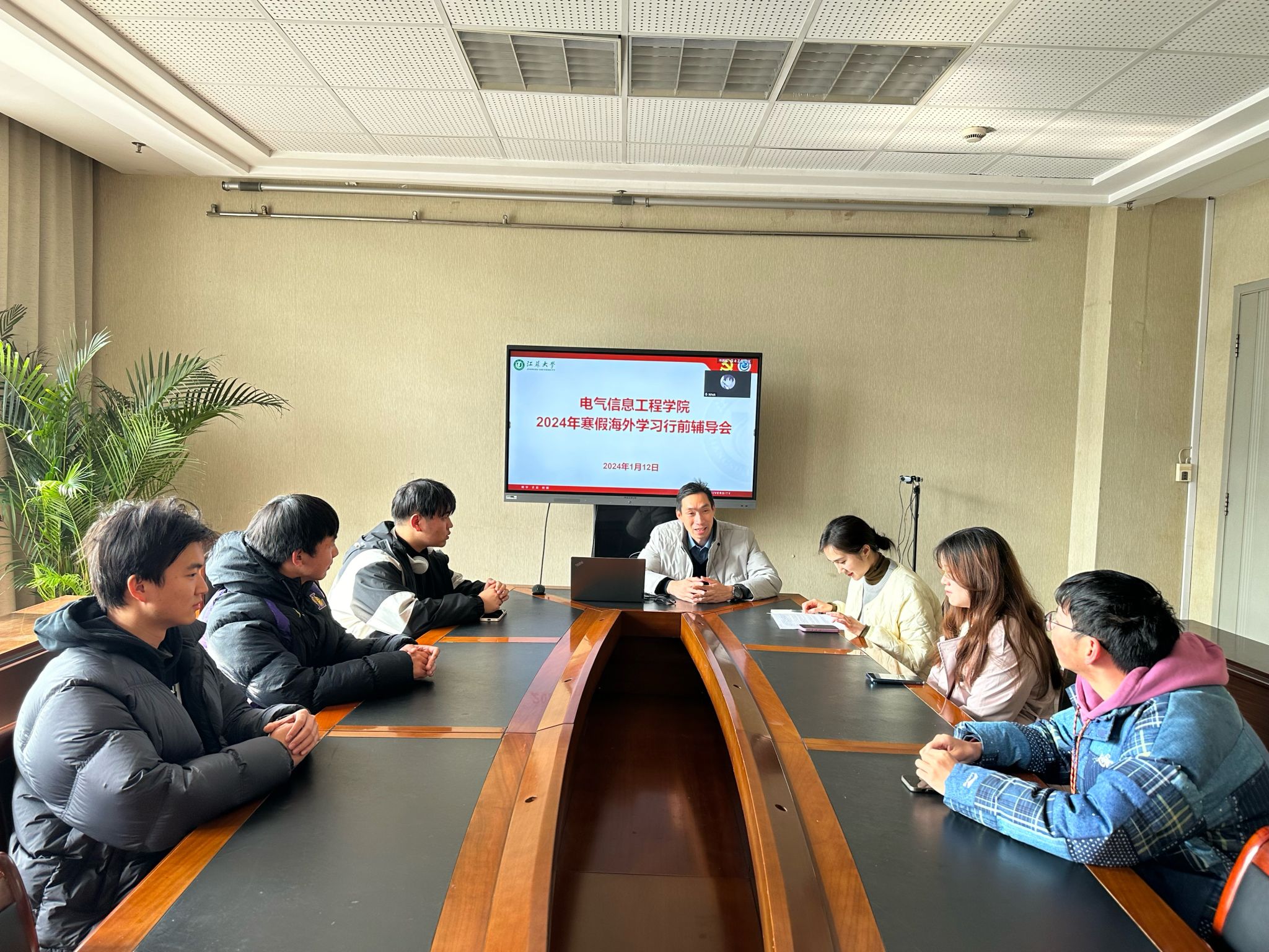 On January 12, the School of Electrical Engineering held a pre-departure counseling meeting for overseas study programs during the winter vacation in 2024 in the 313 conference room of the Electrical Building. Ye Tao, deputy secretary of the Party Committee of the School of Electrical Engineering, counselors Qiu Yuqian and Wang Sijia, and students who signed up for overseas study courses during the winter vacation attended the meeting. The meeting was chaired by Ye Tao.