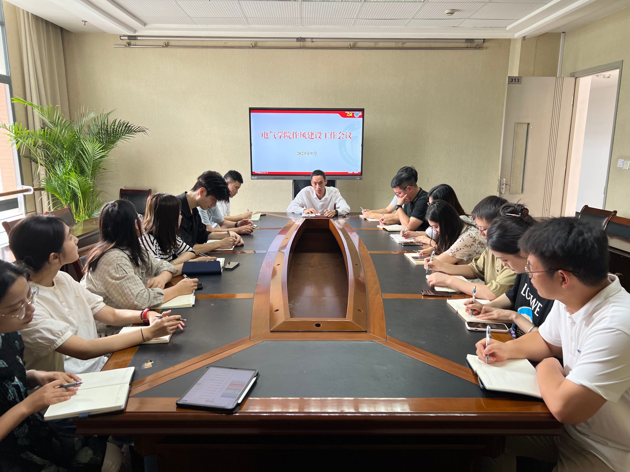 9月4日下午,电气学院召开新学期作风建设工作会议,全体办公室人员参加会议,电气学院党委副书记、纪检委员叶涛主持会议。