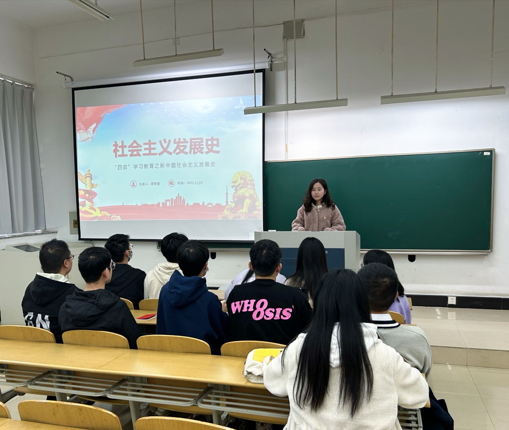 11月23日下午4点,电气学院本科生第三党支部于学院107开展四史教育学习活动,本次学习围绕社会主义发展史展开,由支部书记蒋雯倩作为主讲,支部学生党员参与。