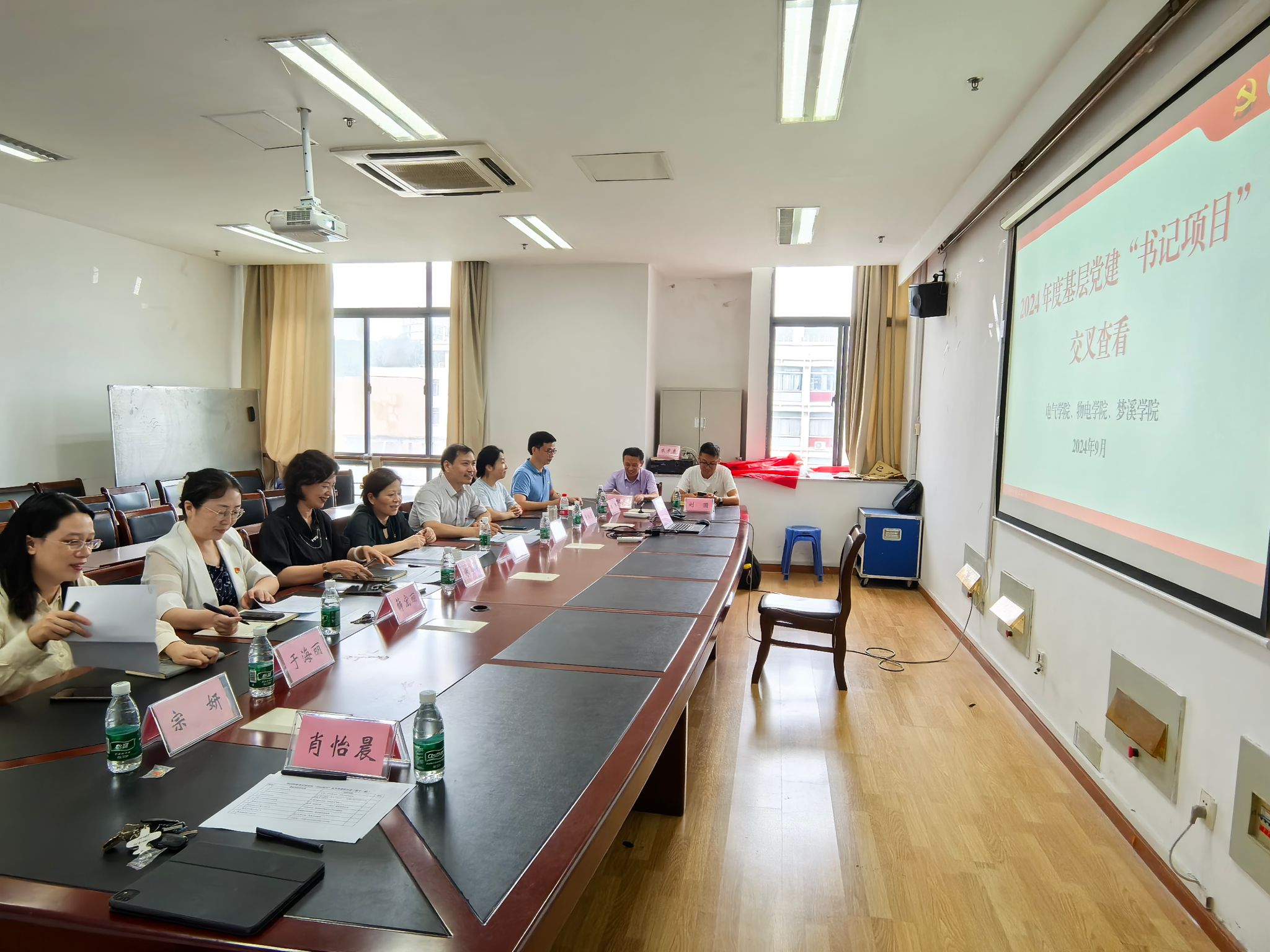 9月25日,根据校党委安排,电气学院党委牵头物理与电子学院党委、梦溪学院党委在电气楼404召开2024年度基层党建“书记项目”(第十一组)交叉查看工作会议。校督查党建专员张红、电气学院党委书记朱晏、物电学院党委书记潘金彪、梦溪学院党委书记薛宏丽以及相关基层党支部书记、各学院党务办主任参加会议。