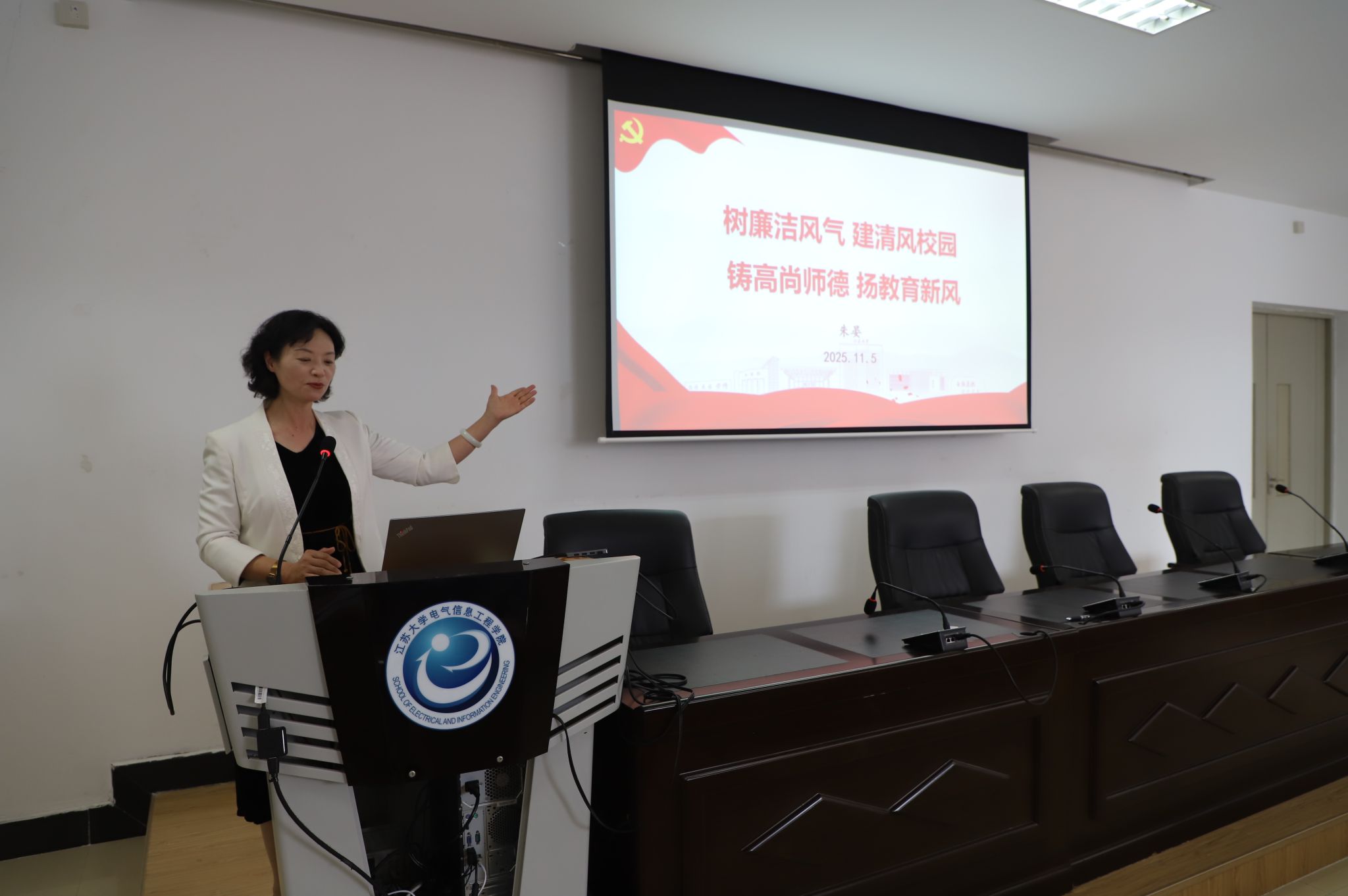 11月5日,电气学院在电气楼415开展廉洁教育专题讲座,电气学院党委书记朱晏作“树廉洁风气 建清风校园 铸高尚师德 扬教育新风”主题宣讲,学院全体教师参加学习。