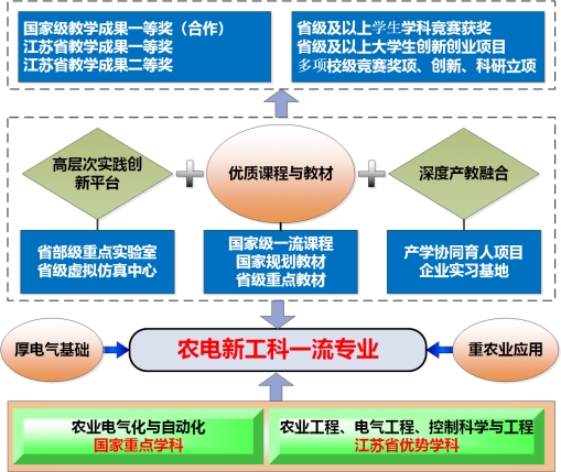 秉承“工中有农、以工支农”办学特色,厚电气基础,重农业应用,农业电气化专业形成农业装备电驱动及智能控制、农业信息分析与决策的“农工新融”专业特色,紧扣国家一流本科专业建设标准,围绕“双一流”建设目标,扎实学生专业基础,强化实践创新能力,以课程建设+实践创新为两翼,产教农工新融、协同创新育人的人才培养特色。以“农业装备运动控制”和“现代农业信息技术”两大课程群,以国家一流课程、国家精品课程、江苏省一流课程等系列优质课程,教育部产教协同育人等省部级教改研究项目有效保障农业电气化专业人才培养目标。