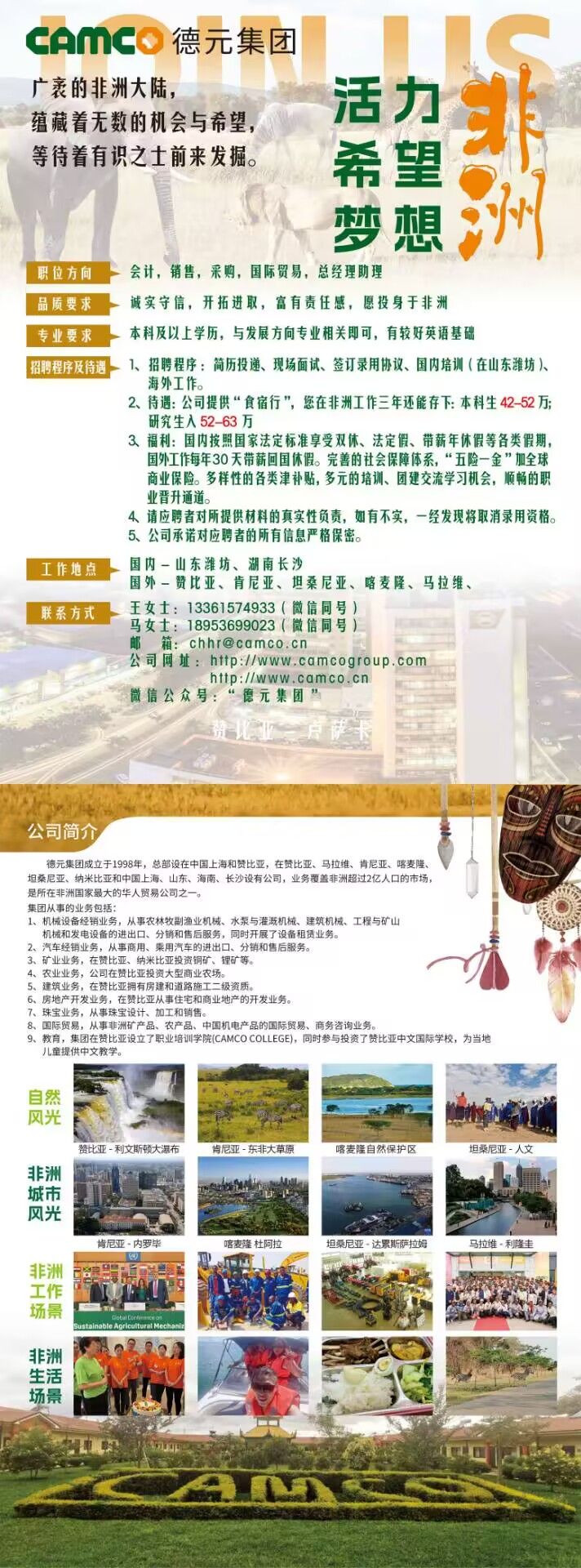 【工作地点】:国内一山东灌坊、湖南长沙,国外-赞比亚、肯尼亚、坦桑尼亚、喀麦隆、马拉维