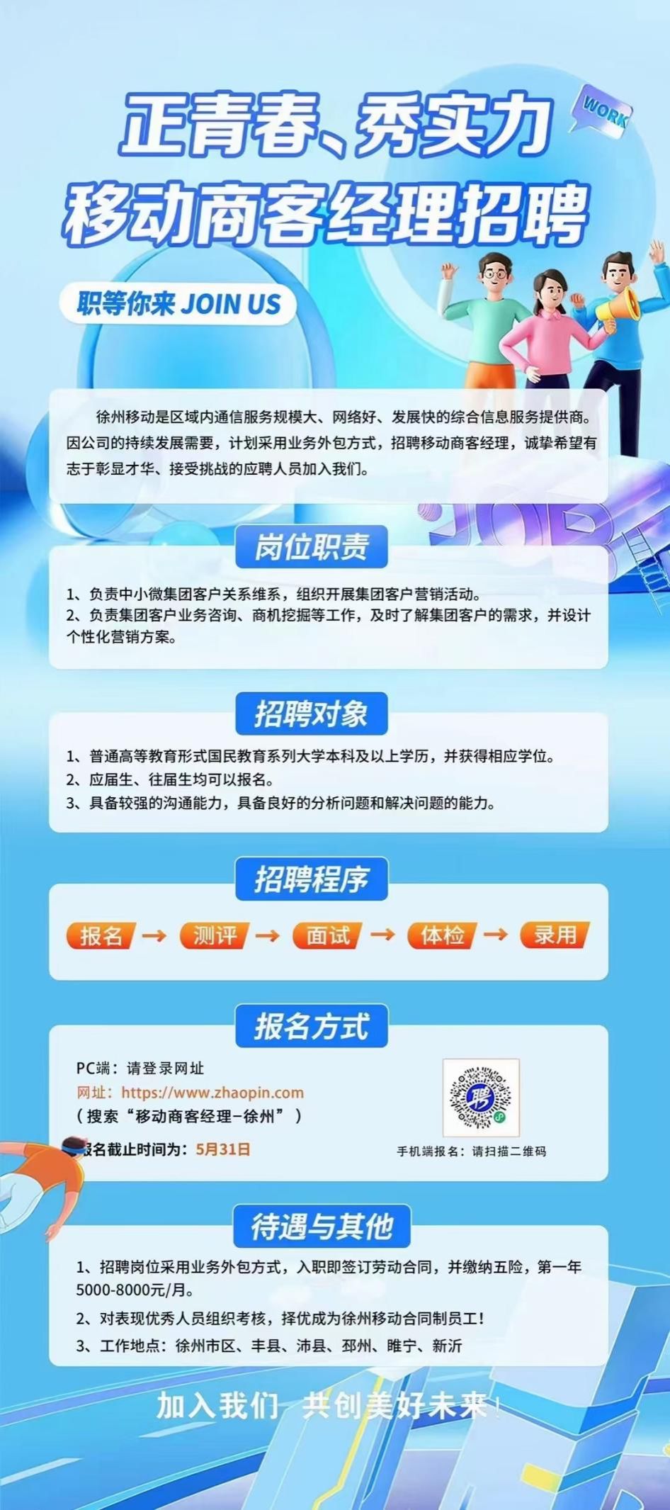 【报名网址】:https://www.zhaopin.com(搜索“移动商客经理-徐州”)