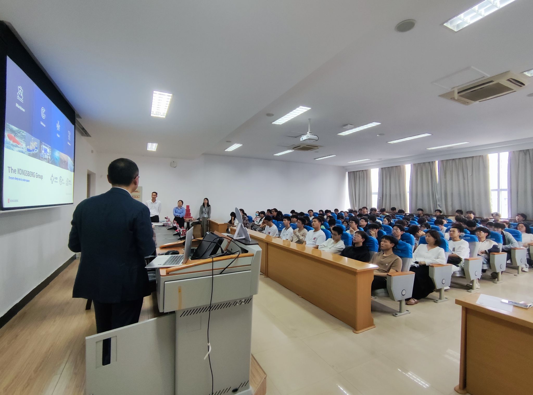 会上,叶涛对来访企业表示热烈欢迎,简要介绍了学院事业发展成绩和学生高质量就业成效。高军介绍了康士伯海事的公司概况,总部位于挪威康斯伯格市,主要生产研发海洋领域中的自动监测控制系统产品;和同学们普及了国际航运形势,让同学们对当下的行业情况有更多了解。沈嵘凡则对职业发展、职场资源、面试技巧等方面进行了介绍,并现场发布了人才招聘计划和校招岗位,表示欢迎同学们在未来加入康士伯公司。在Q&A环节,同学们对岗位要求、技术支持等进行了提问,嘉宾们回以耐心解答,并为同学们赠送了精美的企业周边。