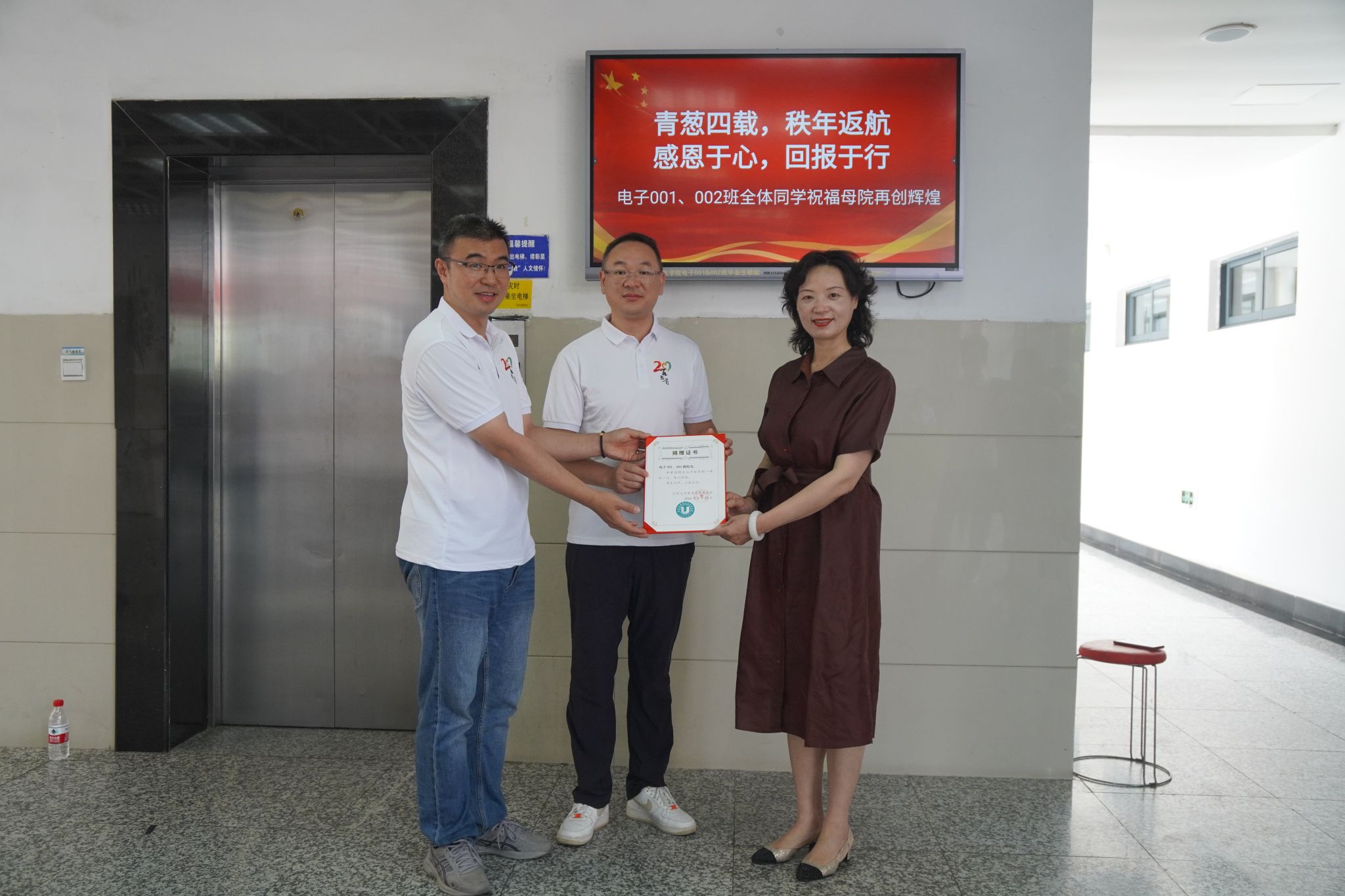 会前,与会领导、校友在学院一楼门厅举行了电子屏捐赠仪式,朱晏书记和孙月平校友共同为电子屏揭牌。深圳市昀华商科技有限公司董事长陈亮、江苏东洲物联科技有限公司董事长费翔校友作为代表接受了捐赠证书。
