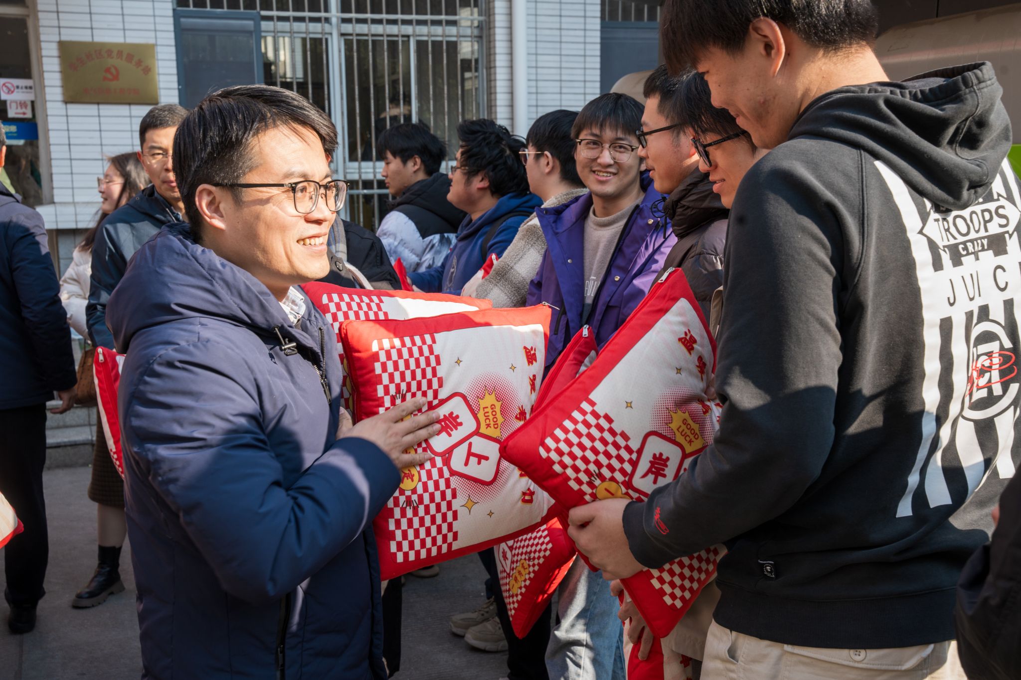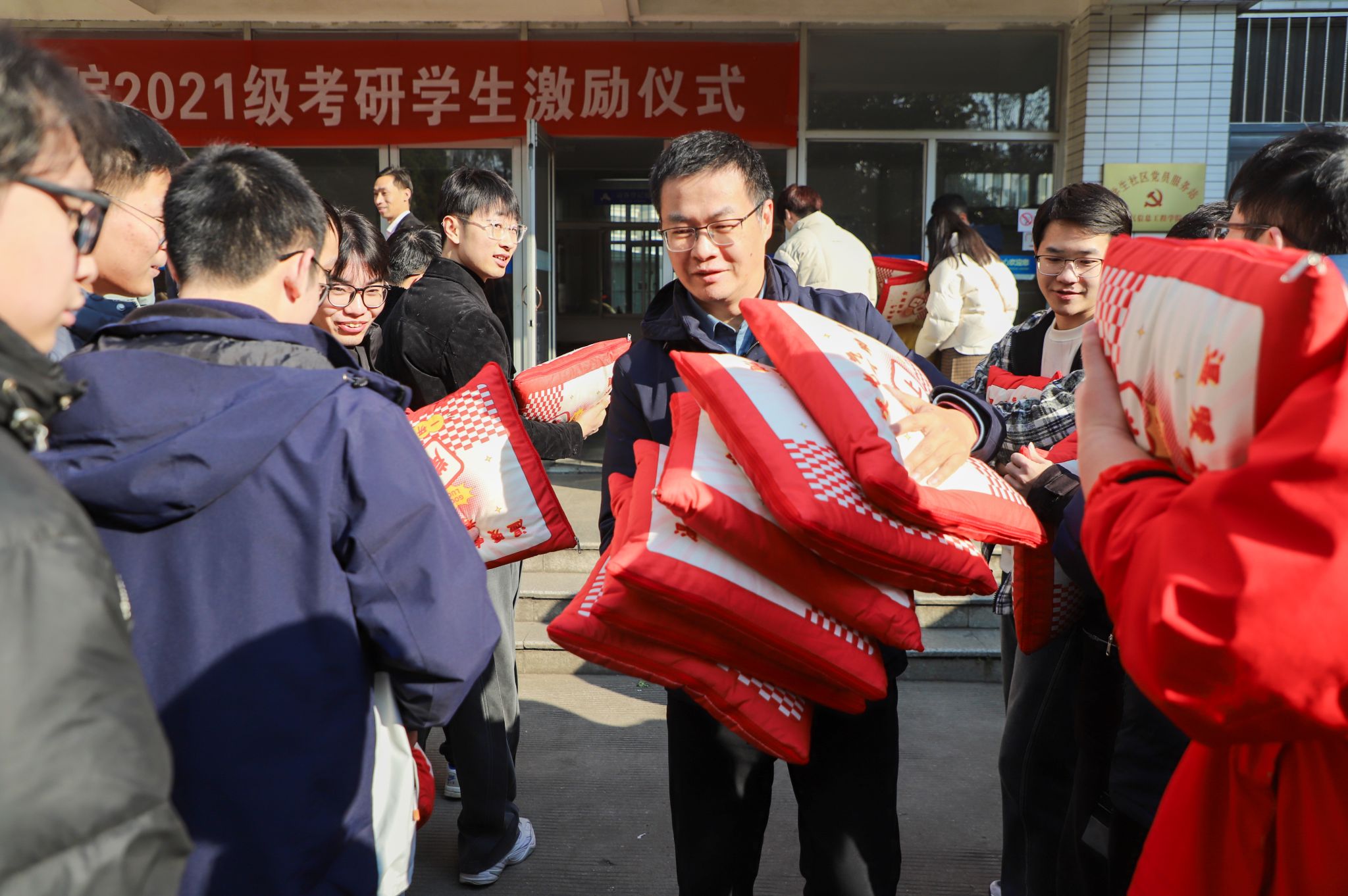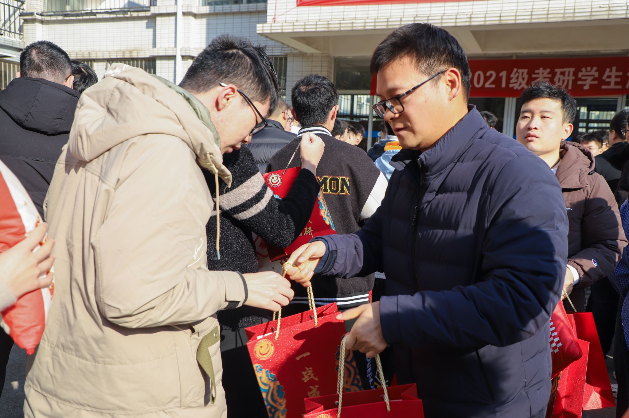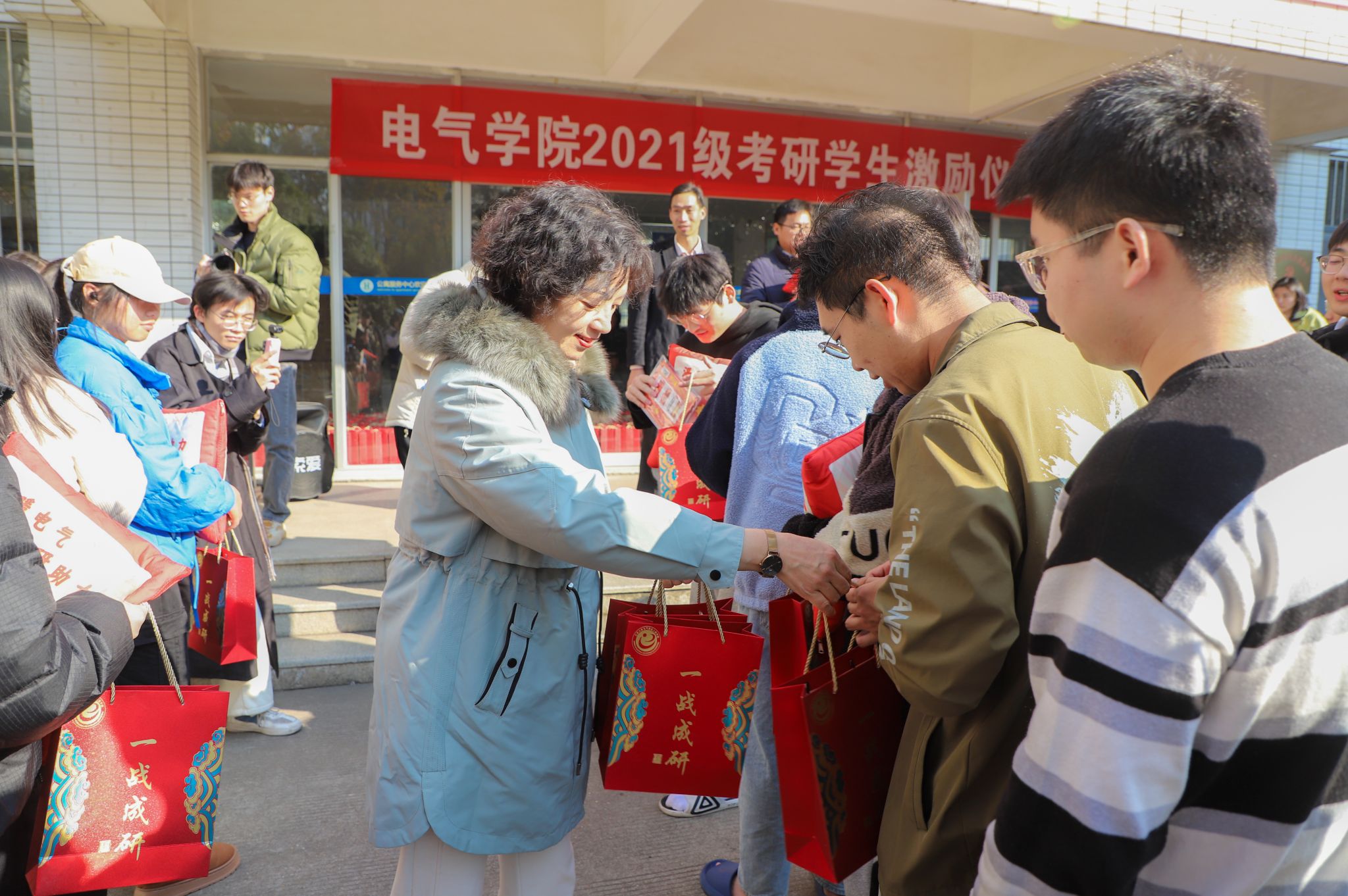 在现场,院领导一起为现场的考研学生代表发放慰问物资,每个注有“一战成研”的红色礼袋装有孔庙祈福文具套装,补充能量的旺仔牛奶、奥利奥饼干和印有“温暖电气,考研助力”的纯棉抱枕,在发放物资的同时,院领导不断地用鼓励的话语、暖心的微笑为同学们加油打气。最后,全体人员合影留念,各专业毕业班辅导员有序将激励物资发放给所有考研学生!