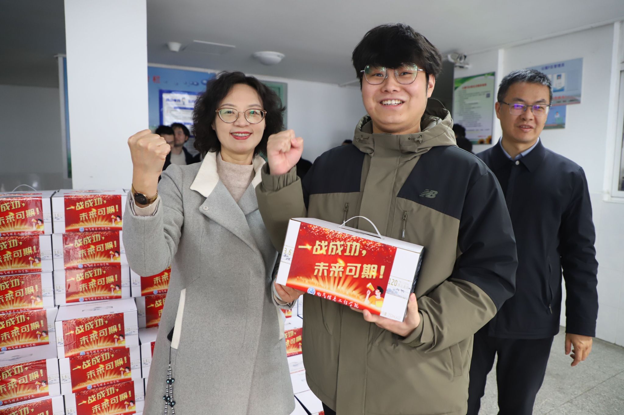 接着,院领导一起为现场的考研学生代表发放慰问物资,每位考研学生都获得了一箱贴有“一战成功,未来可期”的特仑苏牛奶,在发放物资的同时,院领导不断地用鼓励的话语、暖心的微笑为同学们加油打气。最后,全体人员合影留念,各专业毕业班辅导员有序将激励物资发放给所有考研学生!