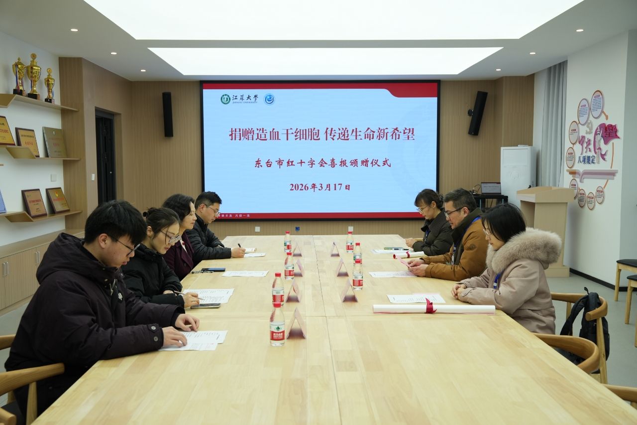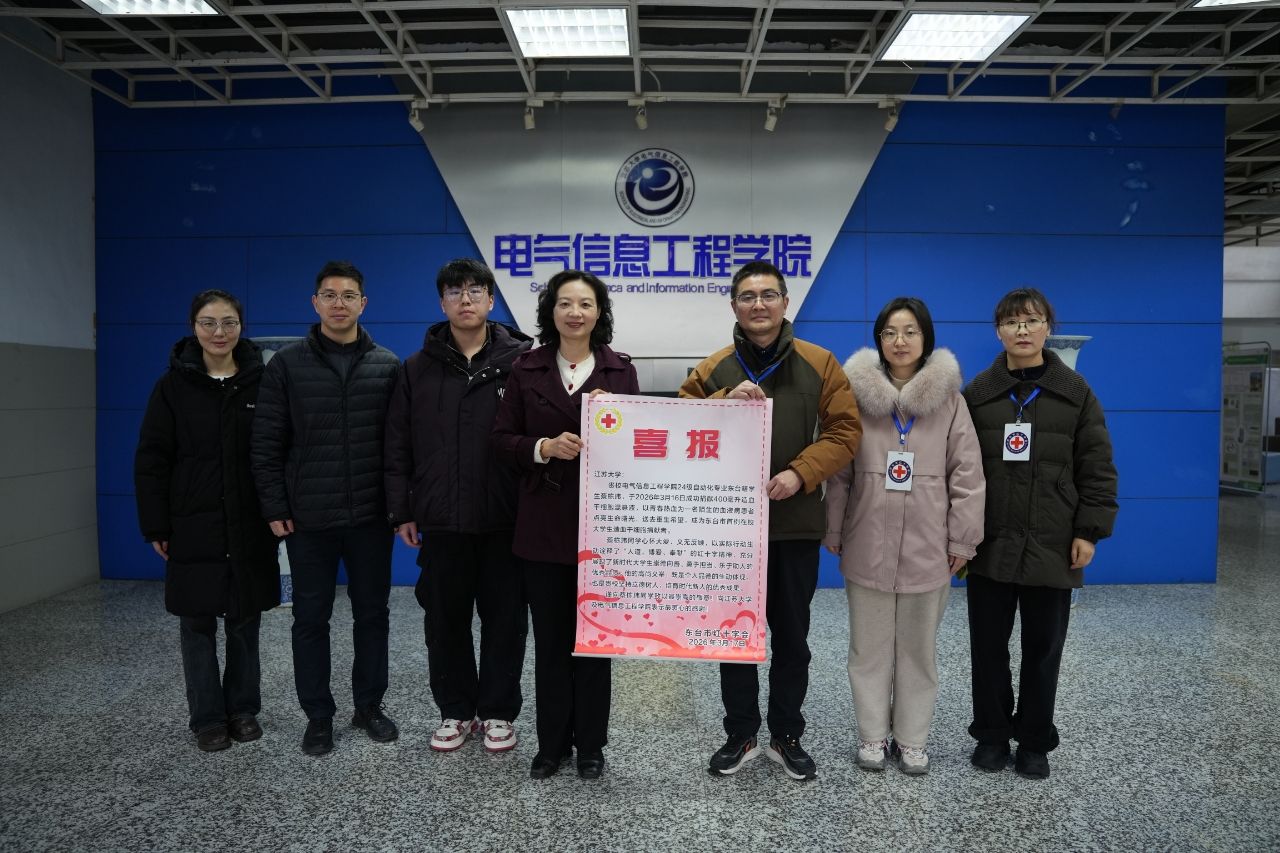 3月17日下午,东台市红十字会秘书长何斌一行来访我院,为电气学院和自动化专业2024级学生蔡栋玮颁赠喜报,表彰蔡栋玮捐献造血干细胞的大爱善举。学院党委书记朱晏、团委书记褚亚伦、辅导员王媛媛共同见证这一温暖而光荣的时刻。