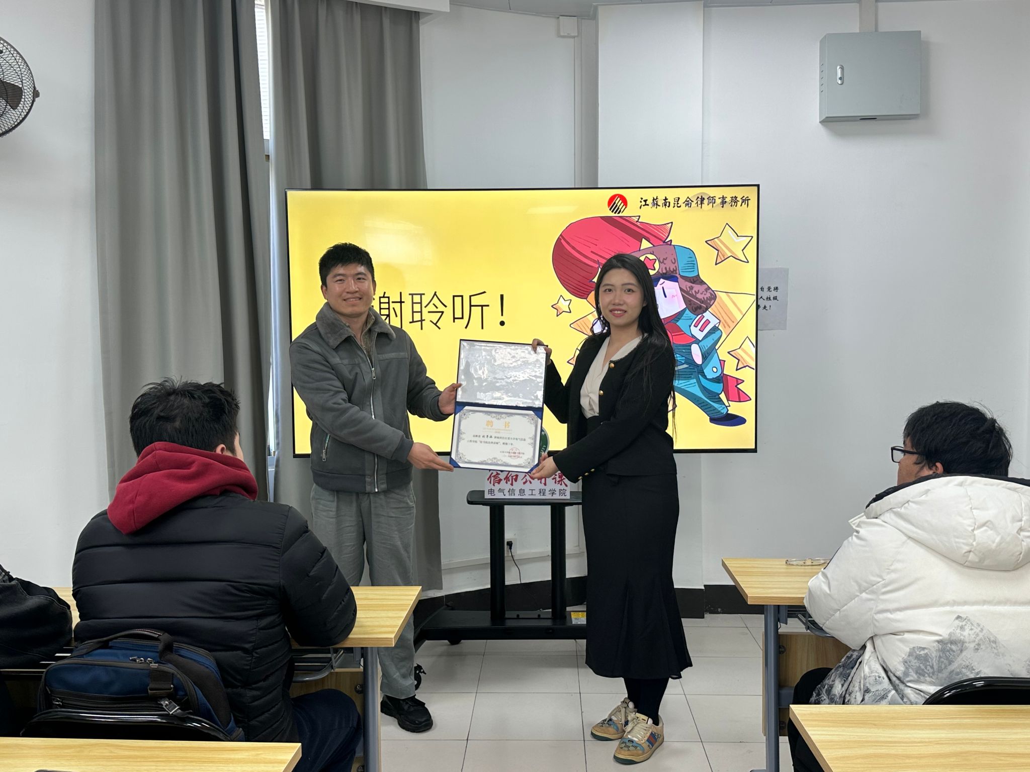 活动尾声,钟灵书院辅导员张东阳为刘子涵律师颁发聘书,正式聘请其担任书院“驻院法律讲师”。张东阳表示:“法治教育是大学生成长必修课,刘律师的专业背景与实务经验将为书院构建‘法律咨询服务+主题沙龙+模拟法庭’多维育人体系提供强力支撑。未来,双方将围绕网络暴力防范、创新创业法律支持等主题开展系列合作,助力学生系好人生‘法治纽扣’。”